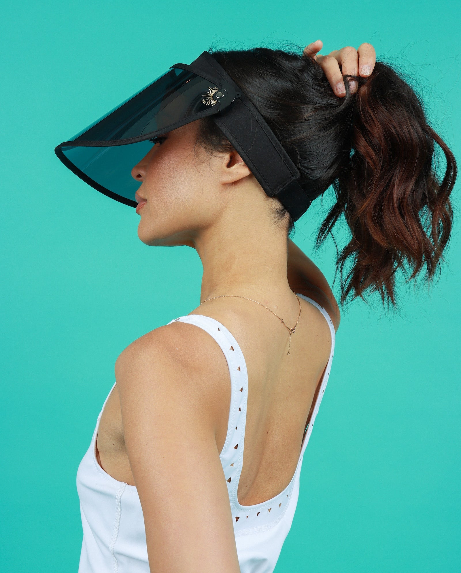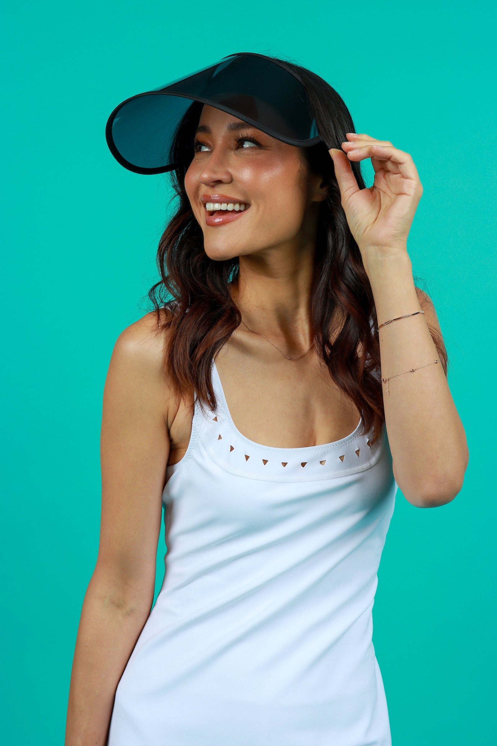 Introducing our newest addition: the sleek all black visor! With its transparent see-through lens, this fashion statement offers unrivaled protection. The adjustable comfort band keeps it in place during any activity. Whether you're playing pickle ball, beach volleyball, practicing yoga, or cartwheeling in the grass, this visor provides long-lasting comfort with no pressure on your head. Say goodbye to messy sunscreen and hello to flawless skin. Get yours today!