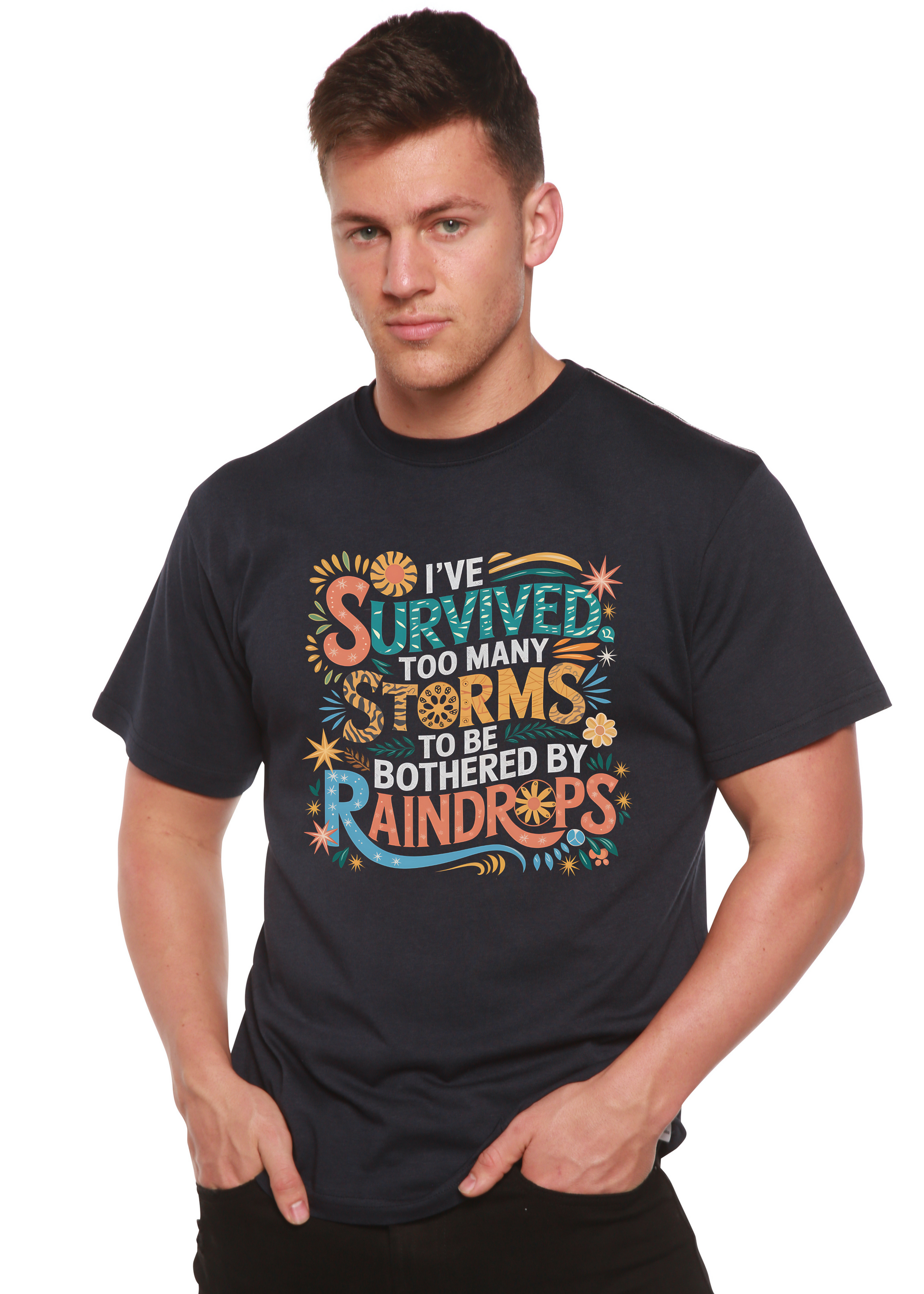 Our I've Survived Too Many Storms to Be Both Unisex Bamboo/Cotton Graphic T-Shirts are celebrated for their superior moisture absorption and wicking capabilities compared to cotton shirts. Known for their breathability, bamboo viscose shirts have been proven to remain 1-2 degrees cooler than standard cotton shirts. If you've only worn cotton, nylon, or other fabric blends that often foster odors and bacteria, our bamboo viscose T-shirts will surely surpass your expectations. Not only aesthetically pleasing, their tactile quality is truly remarkable. Unlike other brands that use thinner, substandard fabric susceptible to significant shrinkage and damage, we prioritize quality.
